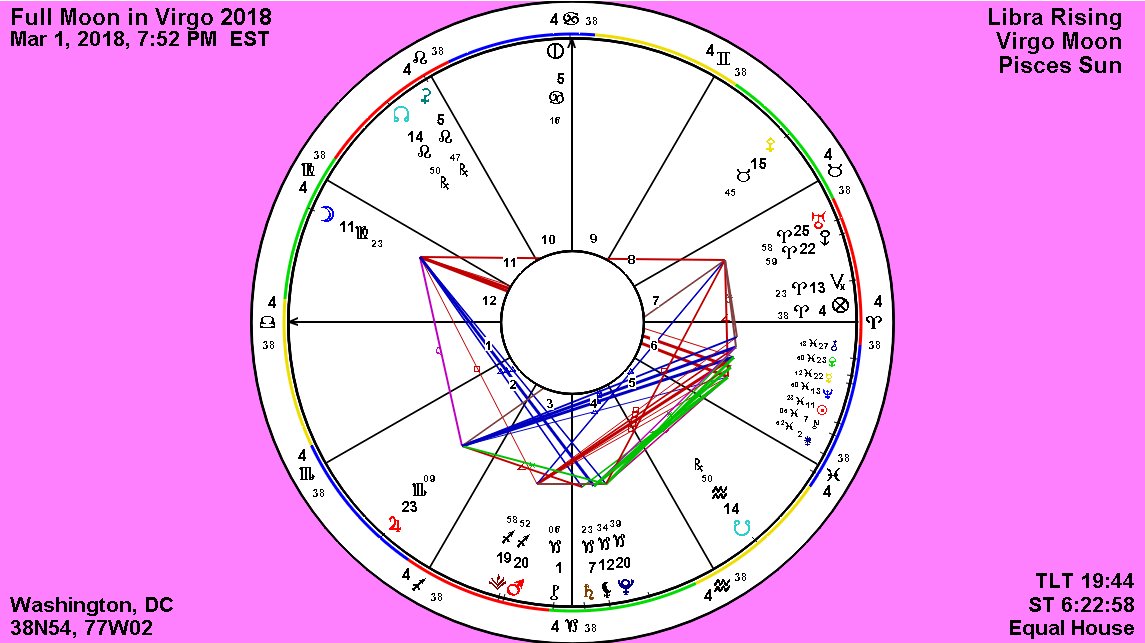 It served my heart well to see all the Pisces energy in this chart contained in the 6th house. Of course, this is a chart for the Full Moon (see chart below) as it occurs in Washington, DC. The house positions shift due your location. But, still, I'm glad to see it organized in such a way at the capitol of my country.